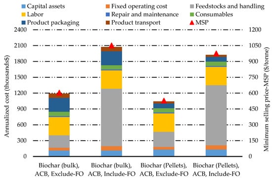 Examining the MSPs in Figure 6 and Figure 7, several conclusions can be made. First, biochar production in pellet form had lower MSP compared to biochar production in bulk form. Second, the inclusion of forest operations significantly affects the MSP in both BSI and ACB systems; however, the impact of inclusion and exclusion of forest operations in the ACB system was higher than that in the BSI system. This was mainly affected by feedstock and handling costs in the ACB system. Third, the BSI system had higher costs in terms of labor, and capital costs, which significantly increased the MSP of biochar produced in the BSI system compared to that of the ACB system. The productivity of ACB systems, such as the hourly production capacity of biochar, was much higher (by ~5 times) than the BSI system, thus helping to reduce the cost including capital and operational costs. From previous studies, the MSP of biochar production has been reported to be 838–1504 USD/tonne [], and 774–1256 USD/tonne [], depending on temperature, conversion rates, feedstock type, and price.
