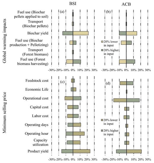 Figure 8c,d show the variations in the MSP due to a 20% change (increase or decrease) in input parameters. Among all input parameters affecting the MSP of biochar pellets, the most influential input parameters were biochar yield, operational cost, and feedstock costs, which are common to both BSI and ACB systems. The operational days in a year and operational hours had higher impacts for the BSI than the ACB system. These results may guide the stakeholders, such as a biochar producers, to prioritize their focus on parameters to improve environmental impacts of biochar pellets and financial performances of BSI and ACB systems.