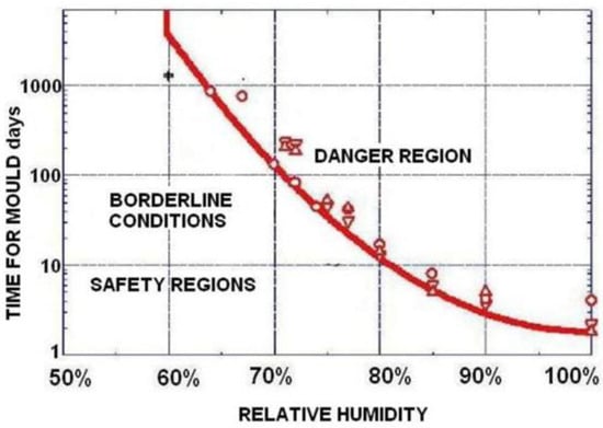 Relativity humidity greater than 75%, depending on the duration, can cause mold. See Figure 1 to see the frontier that defines the effect (as an example, 100 days over 70% or 10 days over 80%). It should be noted that the effect is attenuated if, within the period, there are variations that cause the relative humidity to fall below these values.