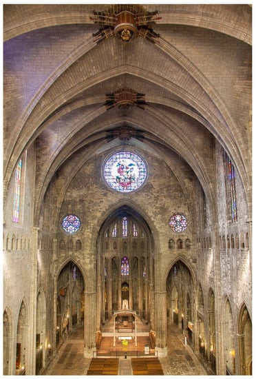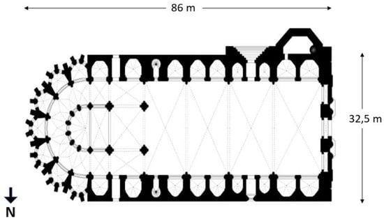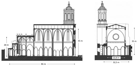 The case-study building is a mostly Gothic-style cathedral [24,25]; construction of the apse began in the fourteenth century, and the entire main nave was completed in the seventeenth century. Unlike gothic cathedrals, it consists of only one nave, with chapels on the sides, instead of the three naves typical of this style. The roof is made of rubble-filled stone vaults; above this level, there is a permanently ventilated empty space and a tiled roof above. The floor is made of stone slabs. Like in every gothic cathedral, there are stained-glass windows: four large windows on the north façade, three large windows on the south façade, a large rose window on the west façade, and three small rose windows on the apse on the east façade. The approximate geometric dimensions of the main volume of the cathedral are 22.8 m. in width, 35 m. in height, and 86 m. in length. The area is 1140 m². and has a volume of 38,760 m³. It was built with Girona stone, and the average wall thickness is 1.2 m. The ground floor plan and a section of the cathedral are shown in Figure 2 and Figure 3; an image of the cathedral is shown in Figure 4.