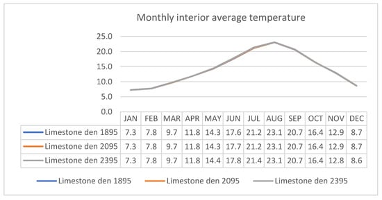 Another conclusion refers to the temperatures that are reached during the coldest and hottest months. The minimum indoor temperature is dampened and never reaches the outdoor average. In the coldest month, the inside temperature is about 5 °C higher than the monthly average temperature. In the case of our study, indoor temperatures are between 10 and 24 degrees, with a maximum daily variation of 0.5 °C. The relative humidity during the year fluctuates from 40% to 75%, with some values above and below, but the maximum daily variation is 10%. These conditions would be appropriate for many pieces of art, according to [23], with the advantage that no HVAC is used and therefore no energy needs to be consumed for their conservation, as is the case in other environments requiring HVAC [12].