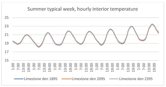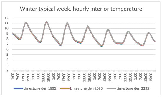 The results show that there are no appreciable differences between the three types of limestone. Therefore, when materials with very important thicknesses and high densities are used, variation in density does not have a significant influence on the calculations. Figure 5 shows the monthly average interior air temperature of the model using the three limestones. We also compared the daily behavior for a typical week in summer and in winter (Figure 6 and Figure 7), and no significant differences were observed.