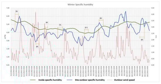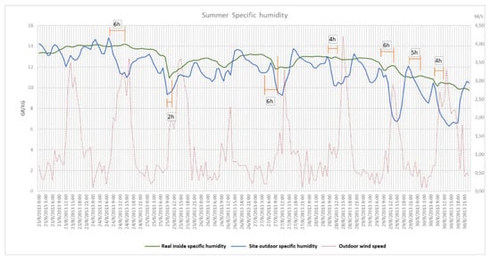 The air change rate was determined based on the study of the evolution of absolute humidity between inside and outside. As shown in Figure 8 and Figure 9, the maximums and minimums measured on the outside of the building are not seen inside until, in most cases, between 4 and 6 h have passed.