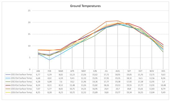 In this building, the temperature of the ground plays an important role in indoor thermal conditions. The temperatures that were considered are the results of applying the outside temperatures and conditions of the space and processing them with the slab utility of EnergyPlus. Figure 10 shows the results. To obtain more accurate data, the calculation was performed with two consecutive years of the same climate file. In this way, the results consider the thermal inertia of the previous year. The calculation reveals that the most important difference between the two years is in the month of January; in the other months, the temperatures are equal.