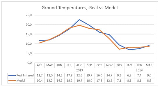 From April 2013 to March 2014, the ground temperature was collected once a month with an infrared thermometer (TESTO 835 T1) [30] in order to compare the real temperature to the model temperature. We followed a similar approach to the one used in [31] to take measurements with the infrared thermometer. Specifically, data were collected according to EN 13187:1998 [32] and the RESNET Interim Guidelines for Thermographic Inspections of Buildings [33], as well as the manufacturer’s instructions [30]. The value of emissivity inserted in the IR-camera ε-value was of (concrete/limestone mortar) 0.93, according the database of Testo Systems. In Figure 11, we can see that the temperature curves are close to each other; the maximum difference is 2.9 °C in August.