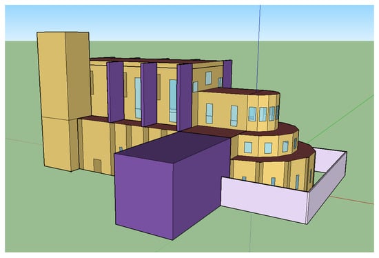 The geometry was obtained from the plans of the cathedral. The model was maximally simplified to speed up the calculation process, while, at the same time, maintaining maximum fidelity to reality. For this reason, three spaces were considered: the central nave (area analyzed), the ventilated roof above the central nave, and the tower. The shadows generated by the buttresses of the cathedral itself and the nearby buildings were also considered. Figure 12 and Figure 13 show some pictures of the 3D geometry model.