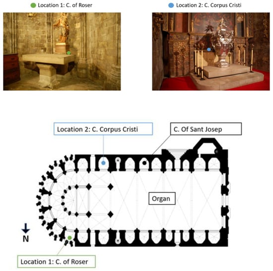 The data logger was installed in the Roser Chapel, which is located just on the north side of the altar, from 2011 to July of 2014, and then was not installed again until March of 2015. In March of 2015, the logger was installed again but in the south in the Corpus Christy Chapel to check for a change in the behavior of temperature curves. This implies that data were collected for the period of 2011–2016, except for the periods of the second semester of 2014 and January of 2015 due to a problem with the batteries of the data logger. Figure 14 shows the position of probes in the monitoring campaign.