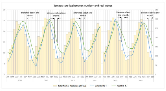 Referring to the annual temperature behavior, the obtained results were partially different from those predicted by the model. The indoor temperature curve was expected to correspond to the average outdoor temperature but with a constant lag throughout the year. This study has shown that this lag exists only for about half a year, from August to January. During this period, there is a one-month delay. This behavior could be explained by the effect of solar radiation during the summer, the significant effect of the terrain helping to dampen the indoor temperature during the winter, and the energy-storage capacity of the envelope.