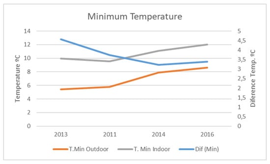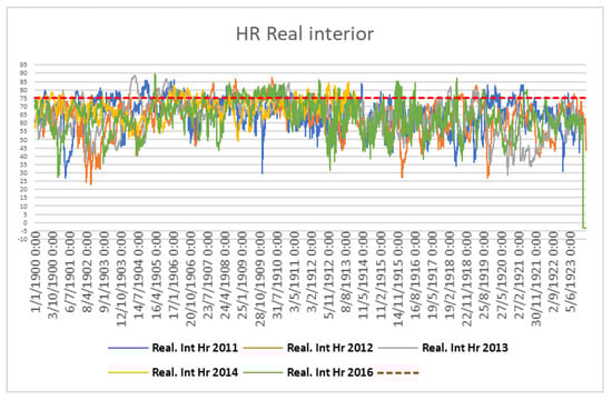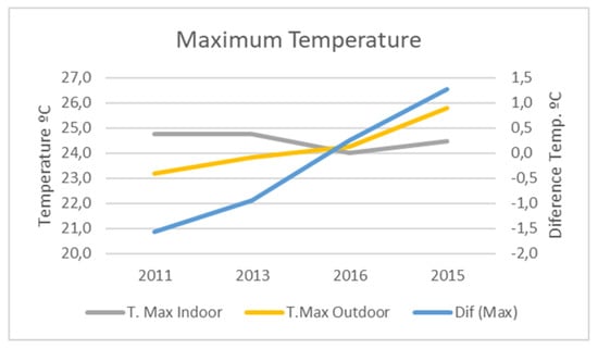 In summer, the interior temperature of the Cathedral remains around 24–25 °C (Figure 16), although the exterior temperature varied above or below. Figure 12 shows the years sorted by the maximum outside temperature to more clearly illustrate this behavior.