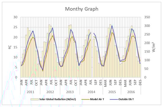 The outdoor temperature, relative humidity, and solar-radiation data of the Girona weather station were used for each year and hour, as well as the indoor temperature and relative humidity collected by the installed data logger. Theoretical indoor temperature was obtained from the EnergyPlus model simulation.