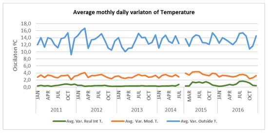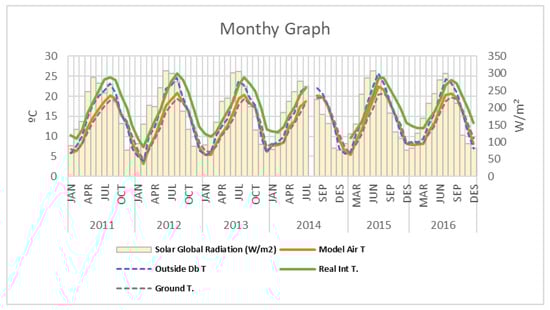 The high heat capacity of the building results in very few fluctuations inside. Whereas the average outer oscillation is 13 °C with peaks of 16–17 °C, the average oscillation of the real indoor temperatures is 0.5 °C, and the model’s air temperature is 3 °C. Figure 21 shows the average monthly daily variation in the outdoor temperature, as well as the real and theoretical indoor temperature.