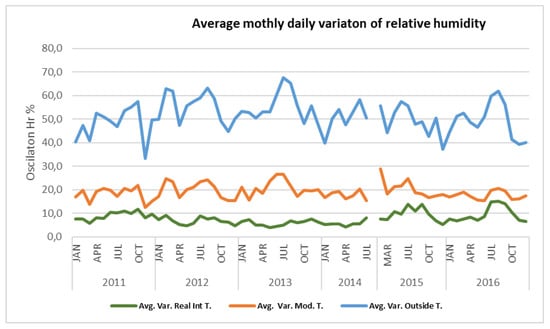Variation of the average monthly daily humidity for the period 2011–2016.