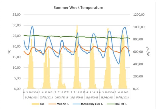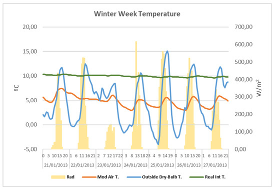 Figure 23 and Figure 24 show, in detail, the relationship between solar radiation, outdoor temperatures, and indoor temperatures, both real and from the EnergyPlus model. Figure 23 corresponds to the winter period, and Figure 24 corresponds to the summer period.