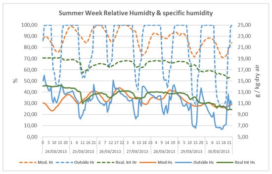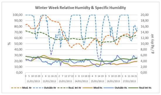 Figure 25 and Figure 26 show, in detail, the relationship between the outdoor relative humidity, the indoor relative humidity (real and simulated), and the real outdoor and indoor specific humidity over a period of nine days. Figure 25 corresponds to a winter period, and Figure 26 corresponds to a summer period.