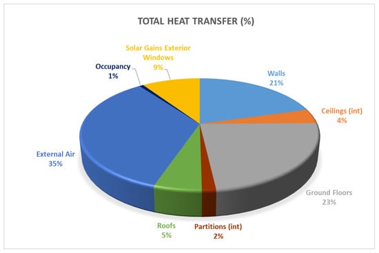 An annual percentage graph was made to illustrate the importance of each item in total heat loss (Figure 27). Heat losses are distributed mainly by infiltrations of air, the ground floor, and the walls; the sum of these items is 79%. Solar gains from the windows represent only 9%, regularly distributed in all months. Heat losses from the roof and ceiling represent 7% of total heat transfer. Heat gains from people represent only 1%.