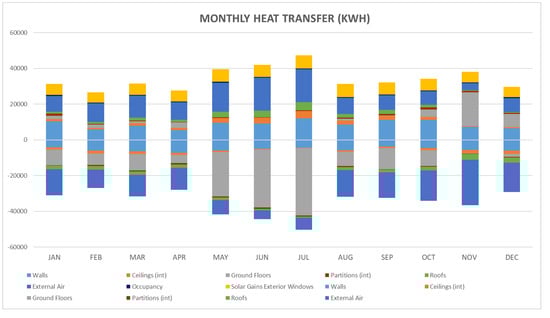 Figure 28 shows how each item affects the energy balance. For instance, the external air is responsible for some gains and some losses; this is due to the fact that the temperature of the external air during the day is higher than the inside air temperature, and during the night, it is lower than the inside air temperature. This effect also occurs with the other elements due to the external thermal oscillation. The floor helps to cool the indoor environment during the months of May to July, and then in November and December, it gives off heat to the internal cathedral space.