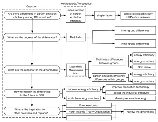 Therefore, based on the previous literature, this paper measures the differences of carbon emission efficiency and its influencing factors in BRI countries using the Theil index and the LMDI method. This study contributes to the literature in the following ways: (1) Adopting a single-factor perspective, this paper measures the carbon emission efficiency of BRI countries in 26 sectors. (2) Considering the large differences in resource endowments and economic development, this paper uses the Theil index to measure the carbon emission efficiency and its spatial differences degree in BRI countries. (3) Based on five groups of BRI countries, the carbon emission efficiency differences inter-group and intra-group are compared. (4) Using the LMDI method, the reasons for the differences between and within groups are analyzed. The technical framework of this paper is shown in Figure 1.