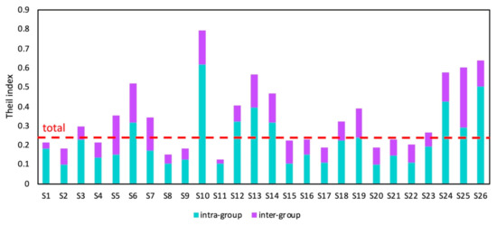 In addition, in order to investigate the specific contribution of different sectors in the carbon emission efficiency differences, the Theil index is used to measure the carbon emission efficiency of different sectors in BRI countries. Figure 2 shows the Theil index of carbon emission efficiency in 26 sectors. First, the Theil index of 20 sectors are higher than the total Theil index. The private household (S24) has the highest Theil index (0.74), followed by the transportation equipment (S10) (0.64). Second, the intra-group differences are higher than the inter-group differences for 23 sectors, such as the agriculture (S1) and the fish (S2). The vast majority of sectors are more affected by intra-group differences, and only a few sectors used to meet the consumption needs of the population are slightly more affected by inter-group differences in carbon emission efficiency, such as the food (S4) and the textiles and clothing (S5) sectors.