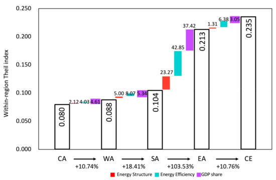 - Between groups, energy efficiency is the dominant factor for most of the differences in carbon emission efficiency. Especially between East Asia and Central and Eastern Europe (EA–CE), South Asia and East Asia and (SA–EA), West Asia and North Africa and South Asia (WA–SA), energy efficiency resulted in increases of 6.38%, 42.85% and 8.07% in the intra-group Theil index, respectively, while energy structure only resulted in increasing contribution of 1.31%, 23.27% and 5.00%. Energy structure causes the differences in carbon emission efficiency between Central Asia and West Asia (CA–WA), which resulted in a 4.61% increase in the intra-group Theil index. The contribution of energy efficiency is more significant than that of energy structure in most sectors between groups. The effect of energy structure is bigger than that of energy efficiency only in a few sectors, such as the food sector (S4) between Central Asia and West Asia (CA–WA).