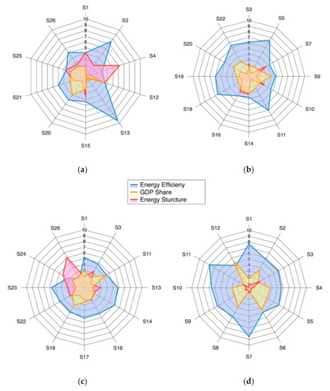 where , , reflects the impact due to the contribution of GDP share, energy efficiency disparity, and energy structure disparity, respectively.