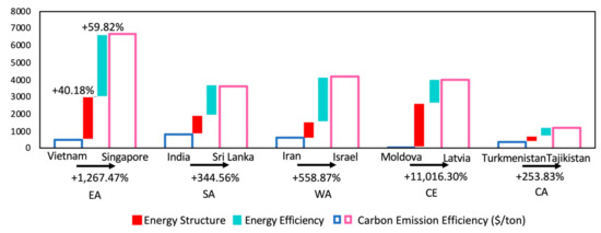 In order to observe the reasons for the carbon emission efficiency differences of countries within groups, the differences in energy efficiency of each group are explored. Energy efficiency mainly depends on the technology used in the production process. Due to the different development levels and technology status of different countries in each group, there are certain differences in the energy efficiency of different countries. In addition, the energy efficiency of each country is related to its industrial structure. Countries with a low proportion of energy-intensive industries, such as financial intermediation, are more energy efficient. Taking East Asia (EA) for example, the differences in carbon emission efficiency in East Asia (EA) are significantly affected by financial intermediation and commercial activities. Singapore and other countries enjoy good economic development, and the tertiary industry has a great advantage; on the other hand, Vietnam and other countries have less developed service industries, which leads to unbalanced development within the group. West Asia and North Africa (WA), South Asia (SA) and Central Asia (CA) development is more balanced. Countries in West Asia and North Africa (WA) own rich oil and gas resources, for example, Iran. With the advanced petrochemical industry, national economic structure and production levels are similar in West Asia and North Africa (WA) countries. South and Central Asian countries have similar industrial structures. However, Central and Eastern Europe (CE) have both developed countries like Slovenia and developing countries with high external dependence on raw materials, energy and technology, such as Moldova. It can be seen that there is a large difference in energy structure within Central and Eastern Europe (CE).
