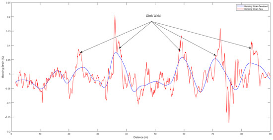 - Data noise interferes with the features of the pipe section. Additionally, in the raw IMU strain data, jagged noises that fluctuate up and down owing to spiral welds and other reasons can be observed. During the process of the manual identification, some pipeline sections exhibit strain values greater than 0.125% only at a few points, but they are classified as bending strain sections. These points with large strain values may be caused by noise fluctuations, whereas it is not necessary to identify these sections when the noise is eliminated.