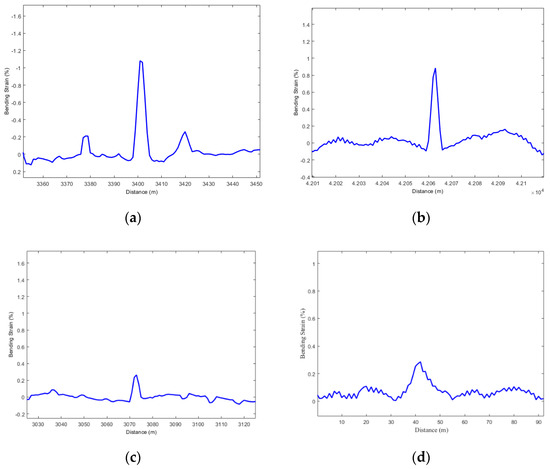 - The bending deformation section: Figure 3d reveals the strain signal of the bending deformation of the pipeline. Due to the nature of the employed long-distance oil and gas pipelines, they often pass through areas with unstable geological conditions or natural disasters, such as earthquake areas and frozen soil areas. As a result, in these areas, large lateral displacement and deformation on the pipeline is easier to be imposed, and in severe cases, a large bending strain will be generated locally. Therefore, these bending deformation features need to be effectively identified by using an in-line IMU inspection method.