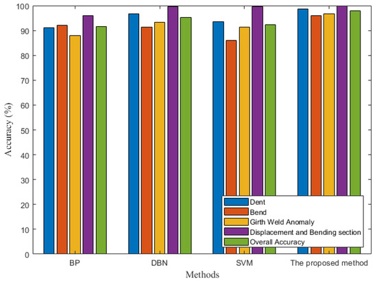 - The PSO algorithm was adopted to optimize the parameters of the DBN model, which improves the training efficiency of the network model, realizes the global optimization of model parameters, and obtains a high test accuracy. The acquired application results show that the accuracy of pipeline feature identification based on the bending strain can reach the value of 97.83%, and the identification efficiency can reach 0.02 min/km.