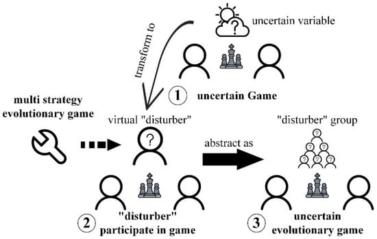 After the player decides strategy for uncertain parameters of the equilibrium point according to Equation (8), any change in strategy will damage the player’s profit, but not the uncertain parameters. When searching , all possible values of parameter are sampled. If the value range of the uncertain factor Y is too large, the process is time-consuming. Therefore, this paper adds a virtual game player “disturber” to introduce a Nash equilibrium point into Equation (8), thus transforming the uncertain game into a deterministic game. The specific process is described below.