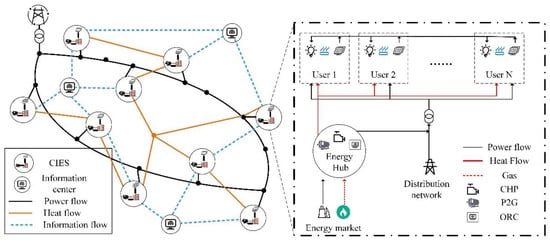 An RIES is composed of multiple CIESs, as well as electricity, heat, gas and communication grids. A 10 kV medium-voltage DN is usually used as the physical framework for an RIES. The system includes distributed PV, CHP, power to gas (P2G), and other energy sources. The load capacity is 5–10 MW. Its energy flow structure is shown in Figure 2.