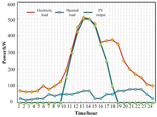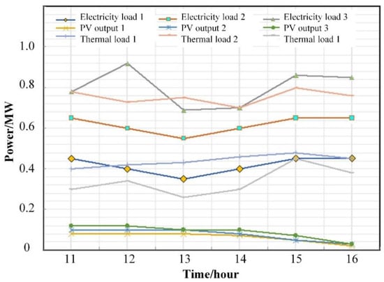 An RIES consisting of three CIESs is adopted as a case study in this paper []. MATLAB R2019a was used on the Windows 10 platform for simulations. Each CIES contained a CHP operator and PV prosumer. The load profiles were reference data from a commercial and residential community on a typical day, where each community included six buildings, and rooftop PV panels range from 100–150 kW. The typical electrical load, thermal load, and distributed PV output profile of a PV prosumer on a certain day are shown in Figure 4. The total load and PV output of CIES1 from 11:00 a.m. to 4:00 p.m. are shown in Figure 5. The dolphin social network model was selected as the social network model, which contained 62 nodes and 159 edges. The power grid electricity price refers to the time-of-use electricity price standards for commercial users in Beijing, China. The power grid purchase price and gas price were set as the feed-in-tariffs in Beijing, China, which are 0.35 RMB/kWh and 1.5 RMB/m3, respectively. The parameters of the CHP in each CIES are shown in Table 1 [].