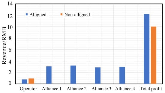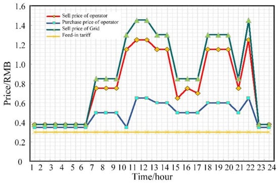 The 62 energy-consuming entities formed four trading alliances, indicating that the maximum modularity Q was reached when the number of alliances was 4. Taking Alliance 3 as an example, by calculating the user potential influence and user similarity, users 5, 6, 9, 13, 17, 22, 31, 32, 39, 41, 48, 54, 56, 57, and 60 can be considered similar. Users in the same community are regarded as an energy transaction whole, whereby all users share the photovoltaic output and adjust the load in each period to maximize the overall income of the alliance. Alliances 1–4 contained 16, 16, 15, and 15 entities, respectively, according to the familiarity of trading strategies and the similarity of energy-using behavior between each user. On the basis of the alliance results, the solution method in Section 4.5 was used to obtain the optimized electricity price, as shown in Figure 7. The electricity sale price of the operator in each period was lower than the price of power grid, which was more obvious from 10:00 a.m. to 2:00 p.m. This is the peak period where PV output met the local load demand. When PV output was reduced after 5:00 p.m., the energy purchase cost of the operator began to increase, thereby increasing the energy sale profit along with electricity prices.
