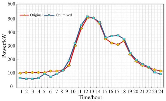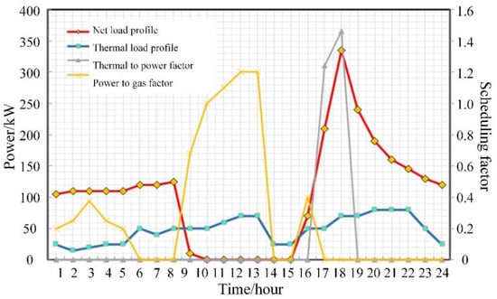 The user load optimization results are shown in Figure 8. By participating in market transactions, the peak load was reduced after optimization. The power consumption during the valley period (12:00–8:00 a.m.) increased, while the power consumption during the peak period (3:00–5:00 p.m.) decreased significantly. According to the optimization result of the operator’s energy purchase scheduling coefficient shown in Figure 9, when the surplus power load was low, it was more economical to purchase electrical energy to convert into thermal energy; hence, the P2G dispatch coefficient was relatively high, as especially obvious from 9:00 a.m.–1:00 p.m. The surplus load was relatively high from 5:00–6:00 p.m., which could be converted into electrical energy by purchasing gas to reduce costs. Therefore, the thermal-to-electricity dispatch coefficient was relatively high.