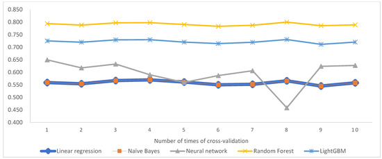 Since the training dataset and test dataset are selected randomly, regression results may have random fluctuations, we then applied the 10-fold cross-validation to assess the performance of five regression models. The scoring function of 10-fold cross-validation is R2. The scores of the models each time are shown in Figure 2 and the average scores of the 10-fold cross-validation are shown in Table 9. Figure 2 indicates that linear regression and naïve Bayes regression show similar accuracy since the corresponding two lines are overlapping. Clearly, random forest regression performs the best with the highest line in Figure 2 and the largest value in Table 9.