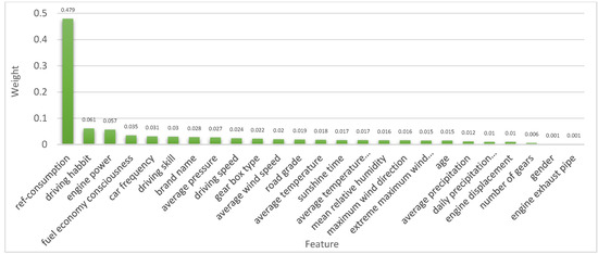 Moreover, in the aspect of environmental factors, air pressure was identified as the most important environmental factor in this study, with a weight of 0.027. Air pressure affects fuel consumption by directly affecting tire pressure. When tire pressure is relatively large, fuel consumption is considered to be lower [62]. Air temperature also affects fuel consumption through tire pressure [63], and its weight in this study is 0.018. Average wind speed and road grade are the second and third most important environmental factors, respectively. The higher the average wind speed is, the greater the air resistance is, and the greater the road grade is, the more gasoline the car consumes [64].
