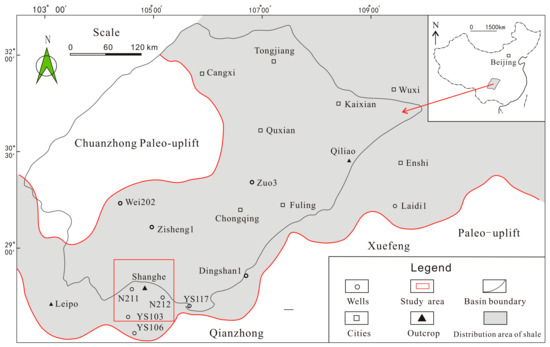 The Sichuan Basin, with an area of approximately 180,000 km2, is located in the southwestern part of China [40]. As shown in Figure 1, the Daba Mountains bound the basin to the northeast, the Daloushan mountain, the Daliang mountain to the southwest, the Qionglai and Longmen mountains to the west, and the Micang mountain to the north [41].
