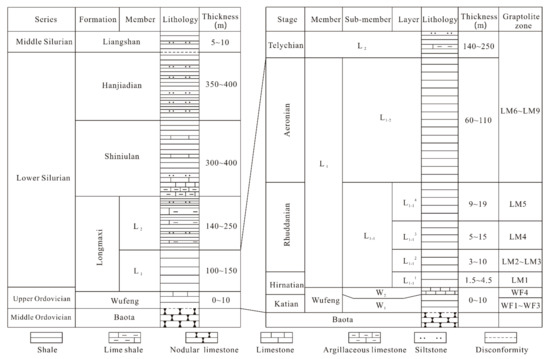 Chart showing the chrono- and litho-stratigraphy, lithology, and shale occurrences in the Wufeng–Longmaxi shale in the Sichuan Basin of southwestern China (compiled from [16,26,51]).
