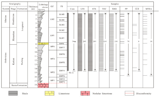 The Wufeng–Longmaxi Formation intervals were formed in the Katian stage in the Upper Ordovician to the Telychian stage in the Lower Silurian and had a total thickness ranging from 240 to 410 m (Figure 2). Currently, the intervals constitute the most important shale gas exploration and development targets in China [30]. The Wufeng Formation, which underlies the Baota Formation at a parallel unconformity and has a thickness ranging from 0.5 to 10 m, is in conformable contact with the overlying Longmaxi Formation, which is successively overlain by the Shiniulang Formation [45]. Within the Wufeng Formation, thick black shales intercalated with multiple thin volcanic ash layers dominate the middle-to-lower regions [46]; limestones/marls with abundant Hirantian fauna fossils dominate the uppermost part of the formation [47]. Within the Longmaxi Formation, black, grayish thin-layered shales or massive shales dominate the lower regions, and grayish-green, to yellow-green shales occasionally intercalated with siltstone and argillaceous limestones comprise the upper regions of the formation [48].