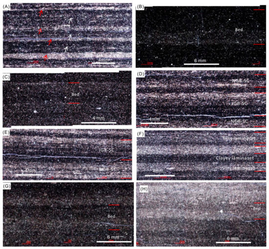 Standard thin section photos showing typical characteristics of laminae, laminasets, and beds. (A) Clayey and silty laminae. Red arrows point to silty laminae, which are mainly composed of siltstone and have brighter color. White arrows point to clayey laminae, which consist mainly of claystone and have dark gray color. Samples were collected in the Longmaxi Formation of the Shuanghe outcrop (sample number: 9-15-1); (B) NGB-C, with a continuous, planar base boundary and an abrupt contact with underlying units, is mainly composed of clayey laminae. From the base to the top, the grain size gradually becomes finer and the color becomes grayer. Samples were collected from the Wufeng Formation at the Shuanghe outcrop (sample number: 4-20-1); (C) IGB-C, with a continuous, planar top boundary and an abrupt contact with overlying units, are mainly composed of clayey laminae as well. From the base to the top, the grain size gradually becomes coarser and the color becomes brighter. Samples were collected from the Wufeng Formation at the Shuanghe outcrop (sample number: 4-37-1); (D,E) NGB-SC and IGB-SC. NGB-SC, with sharp, continuous, and plana base, has silty laminasets at the base that grade into clayey laminasets at the top. IGB-SC, with sharp, continuous, and wavy top, has clayey laminasets at the base that grade into silty laminasets at the top. Samples were collected from the Longmaxi Formation of the Shuanghe outcrop (sample numbers are 9-2-1 and 9-3-1, respectively); (F) Silty and clayey laminasets. Silty laminaset consists of silty laminae intercalated with thin lenticular and discontinuous clayey laminae. Clayey laminaset consists of clayey laminae intercalated with lenticular and discontinuous silty laminae. Samples were collected from the Longmaxi Formation of the Shuanghe outcrop (sample number: 9-15-2); (G) NGB-C, with a continuous, planar base boundary and an abrupt contact with underlying units, is mainly composed of clayey laminae. From the base to the top, the grain size gradually becomes finer and the color becomes grayer. Samples were collected from the Wufeng Formation at the Shuanghe outcrop (sample number: 4-8-1); and (H) NGB-C, with a continuous, wavy base boundary and an abrupt contact with underlying units, is mainly composed of clayey laminae. From the base to the top, the grain size gradually becomes finer and the color becomes grayer. Samples were collected from the Wufeng Formation at the Shuanghe outcrop (sample number: 4-14-1). Abbreviations are shown in Table 1.