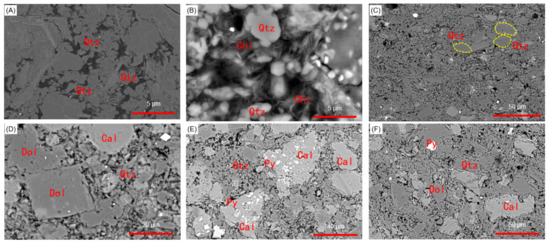 Backscattered electron images showing minerals and grain size of clayey and silty laminae. (A–C) clayey laminae, consisting mainly of claystone, are dominantly composed of quartz (70~90%), OM (15~25%), clay minerals (6~15%), and other minerals. For the clayey laminae, quartz is dominantly clay-sized with grain size less than 8 φ; (D–F) Silty laminae, consisting mainly of siltstone, are dominantly composed of carbonate minerals, quartz, pyrite, and OM. For the silty laminae, quartz is dominantly silt-sized with grain size in the range 4 φ to 8 φ. Qtz: quartz; Cal: calcite; Dol: dolomite; Chl: chlorite; Py: pyrite. Sample number is 8-2-1.