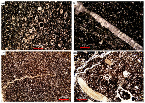 Standard thin section photos taken under orthogonal polarized light showing typical shale components from the Wufeng–Longmaxi shale in the Sichuan Basin of southwestern China. (A) Shale with abundant siliceous sponge fossils (Shuanghe outcrop in Changning County); (B) Shale with abundant sponge spicule (orthogonal polarization, Shuanghe outcrop in Changning County); (C) Shale with trilobite fossil fragments (Shuanghe outcrop in Changning County); (D) Shale with dense fossil fragments (Shuanghe outcrop in Changning County).