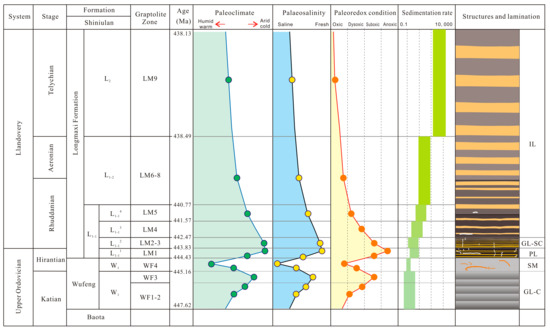 In the Wufeng–Longmaxi shale, the GL-C occurs during the graptolite zone WF1-3 of the Wufeng Formation, the SB during the graptolite zone WF4 of the Wufeng Formation (the so-called Guanyingqiao Bed), the PL during the graptolite zone LM1, the GL-SC during the graptolite zone LM2-3 and the IL during the graptolite zone LM4-9 of the Longmaxi Formation (Figure 9).