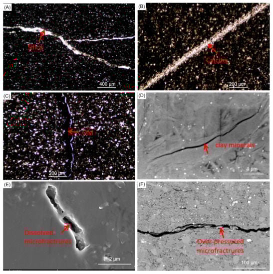In the Wufeng–Longmaxi shale, bedding parallel fractures commonly propagate from within clayey laminae (Figure 8A,C,D) or from along clayey–silty laminae interfaces (Figure 8B). Most bedding parallel fractures are filled with silica (Figure 10A), calcite (Figure 10B), or OM (Figure 10C), and fewer than 15% are filled with clay minerals or pyrite crystallites. Bedding parallel fractures generally connect with each other to form an effective pathway horizontally (Figure 8C), although locally they occur as isolated structures. The length of bedding parallel fractures is commonly 1–4 cm and positively correlated with lamina continuity and thickness. Bedding non-parallel fractures are commonly perpendicular to lamination (Figure 8A,D) and filled with OM or silica. Few are open or contain nothing but crystallites. Vertically, bedding non-parallel fractures can cut through multiple laminae to form networks with bedding parallel fractures (Figure 8A,D). Shrinkage microfractures appear to have propagated from among clay mineral grains (Figure 10D), dissolved microfractures from between carbonate mineral grains (Figure 10E), and over-pressured microfractures from along OM-mineral interfaces (Figure 10F), and their length and abundance are influenced by TOC of the host lamina [59].