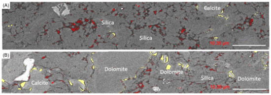 Backscattered electron images showing nanopores and microfractures in clayey laminae and silty laminae. (A) In clayey laminae, organic pores are rich and propagate along organic matters to form dense networks; (B) In silty laminae, inorganic pores are abundant but commonly occur isolated. Note that the red color denotes organic pores, the yellow color represents inorganic pores and the lilac color represents microfractures.