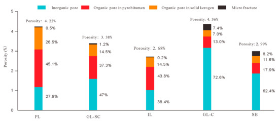 In the Wufeng–Longmaxi shale, the samples are tested to have a total porosity ranging from 2.68% to 4.36%. Among these samples, the organic pore porosity accounts for >50% of the total porosity in the PL, GL-SC, and IL, while the percentage is less than 30% in the GL-C and SB (Figure 13). The ratios of microfracture porosity to total porosity are 7.4% and 8.2% in the GL-C and SB, respectively, which are apparently higher than that in the PL, GL-SC, and IL. According to the above SEM photos (Figure 12), there were a large number of organic matter pores in the pyrobitumen of the Wufeng–Longmaxi shale, with a large diameter and strong connectivity, and solid kerogen had a few organic matter pores. Pores developed in organic matter contributed more to the total organic porosity.
