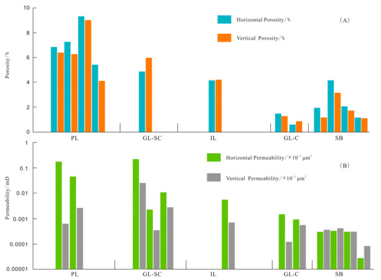 Helium porosity and permeability sampling and analysis were carried out after the depositional structures determination of each sample. Core plugs with a diameter of 2.54 cm and length of 2.5–5 cm were drilled for the porosity and permeability analysis. The porosity was measured using a helium porosimeter (Coreval 700) (Vinci Technologies, Nanterre, France) at a pore and confining pressure of 200 psi and 1000 psi (89 MPa). Permeability was analyzed using a pulse decay permeameter (PDP-200) (Porous Materials Inc., Ithaca, NY, USA) at a pore and confining pressure of 600 psi and 1000 psi (89 MPa) using nitrogen.