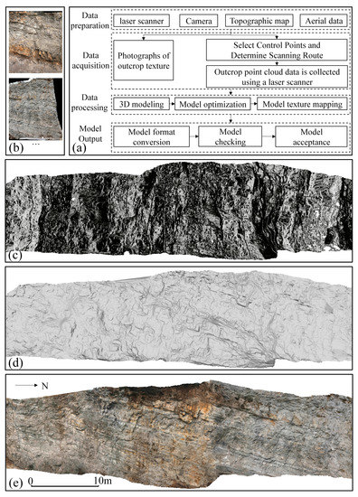 Workflow of DOM creation based on lidar. (a) The primary workflow. (b) Outcrop high-definition picture data captured using a digital camera. (c) 3D point cloud of outcrop collected by lidar. (d) 3D digital outcrop mesh model. (e) 3D digital outcrop texture model.