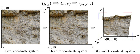 The fractures and cavities vector graphics are saved as 2D pixel coordinates, which cannot be overlaid on the digital outcrop texture model in batch. Therefore, to incorporate the 2D geological information into the 3D digital outcrop model, the 2D pixel coordinates of the contour vertices of the vector graphics must be converted into 3D model coordinates. The DOM is essentially a triangular mesh surface model. If the transformation between each triangle surface in the model skeleton and its corresponding triangular surface in the texture coordinate system is considered an orthographic projection, affine transformation may be used to approximately invert this projection connection. Based on this, we may project any point in the model’s texture picture onto the DOM’s surface. The projection transformation method for each vertex in a 2D graphics contour consists of two steps (Figure 3): (1) 2D pixel coordinates to 2D texture coordinates; (2) 2D texture coordinates to 3D model coordinates.