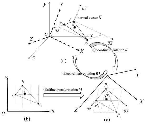 After the rotation transformation, the corresponding points of the three vertices p1(x1, y1, z1), p2(x2, y2, z2), and p3(x3, y3, z3) of the triangle ∆ (p1, p2, p3) in the local 3D coordinate system can be obtained, which are recorded as P1(X1, Y1, Z1), P2(X2, Y2, Z2), and P3(X3, Y3, Z3). The Y value of all points on the triangle surface ∆ (P1, P2, P3) is a constant Y0, Y1 = Y2 = Y3 = Y0, since the local coordinate system’s Y-axis is perpendicular to the triangular surface ∆ (P1, P2, P3). Therefore, the mapping relationship between the triangular surface ∆ (P1, P2, P3) and its corresponding triangular surface ∆ (t1, t2, t3) in the texture coordinate system can be regarded as an affine transformation between two 2D triangular surfaces (Figure 4b,c).