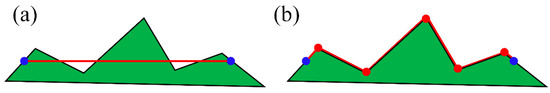 Schematic diagram of reconstruction of fracture-cavity graphics. In (a), the red line represents the line segment between any two points on the contour of the fractures or cavities, and the blue point is the two vertices of the line segment. If only the blue vertices of the contour edge are converted to the model surface, the red line segment does not fully fit the model. In (b), the red line is reconstructed to generate multiple red points. By connecting all points, the graphics fit perfectly with the model surface.